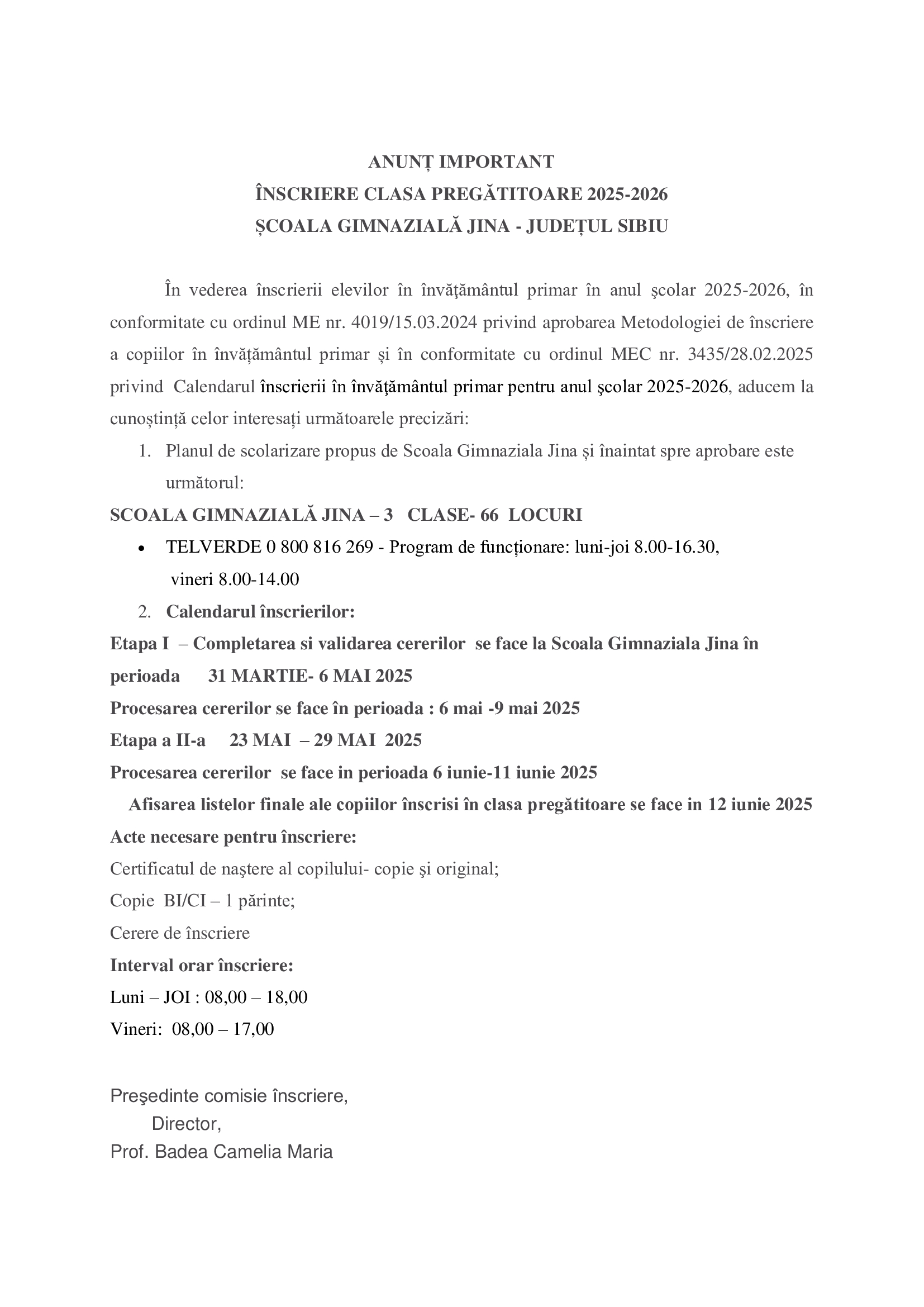 - Informații suplimentare la tel 0269/532109 sau pe site-ul școlii https://scoalajina.ro